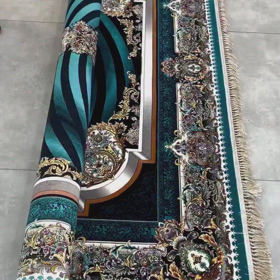 Experience the grandeur of authentic Persian craftsmanship with the Farsh Majlesi Edition — a masterpiece that blends royal tradition with modern elegance. Inspired by ancient Persian palatial art, this carpet features an intricate central medallion design, deep teal and black hues, and refined grey detailing that add depth, balance, and sophistication to any space.